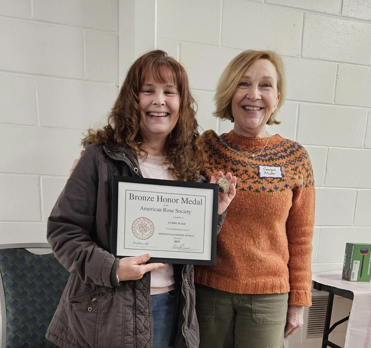 Photo: Georgia Mohr, Past President of the Winston-Salem Rose Society, with Cyndy Scalf following the presentation of the Bronze Honor Medal.